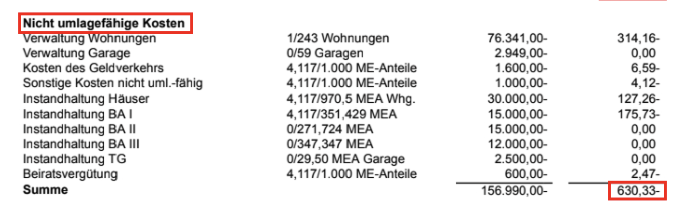 Hier siehst du eine beispielhafte Darstellung der Kosten in einem Wirtschaftsplan, die nicht auf den Mieter umgelegt werden können.